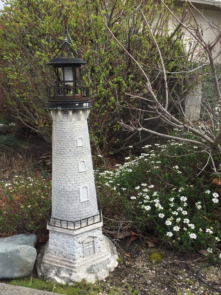 While I was most impressed by the yard art in the block north of Ashland Street, I was most impressed with the flowers in the block south of Ashland Street. Roi has a lovely garden.Across the street I found a beautiful flowering cherry tree.Here is a close-up photo of the flowering cherry blossoms, at their peak in late March.Ashland has many old houses built in the Craftsman architectural style. Here is an attractive modern Craftsman style house.Basketball and flowering cherry blossoms don’t normally go together, but they do on Ray Lane.For our last Ray Lane photo, here is some unusual yard art. At least I have never seen any other lighthouse yard art like this in Ashland.